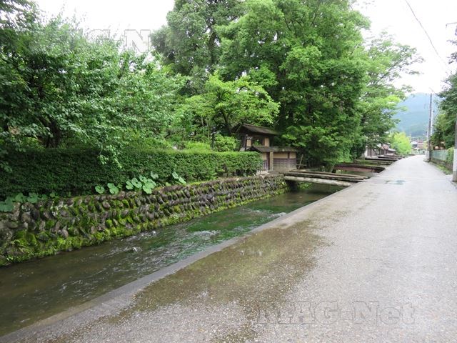 小川である「沢端川」に玄関を向けた藁葺きの屋敷があります。