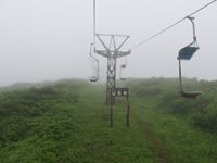 霧の中を進むリフトは、ガスのために少し先は真っ白で何も見えません。