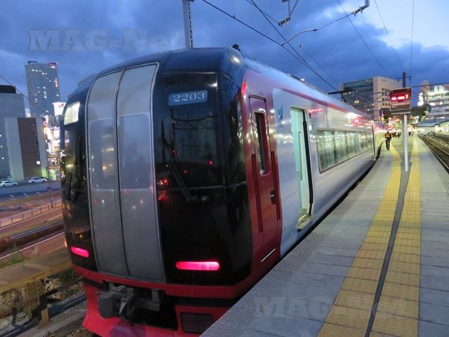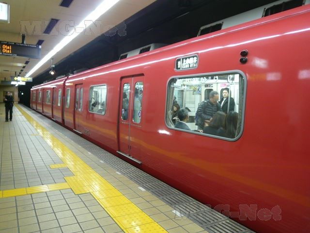行きに乗った地下鉄鶴舞線では、真っ赤な車体がホームに滑り込んできました。これは、名鉄の電車なのでしょう。