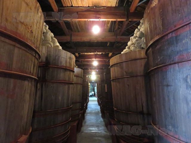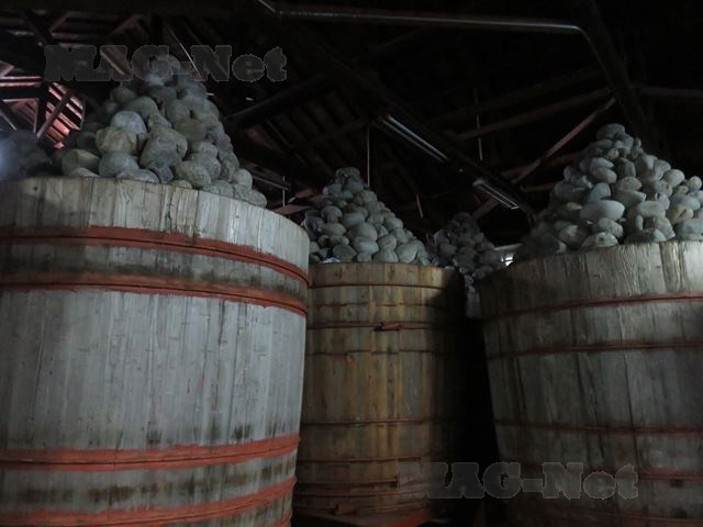 倉庫には大きな味噌樽が並び、蓋をした樽の上には石がピラミッド型に積まれています。