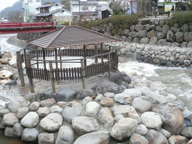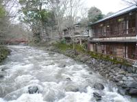 温泉が立ち並んぶ河辺で水の流れを眺めていると、ゆったりした気分になります。